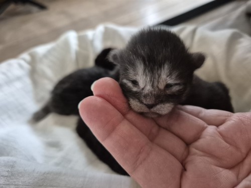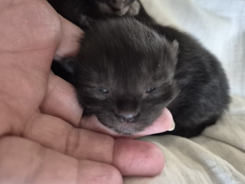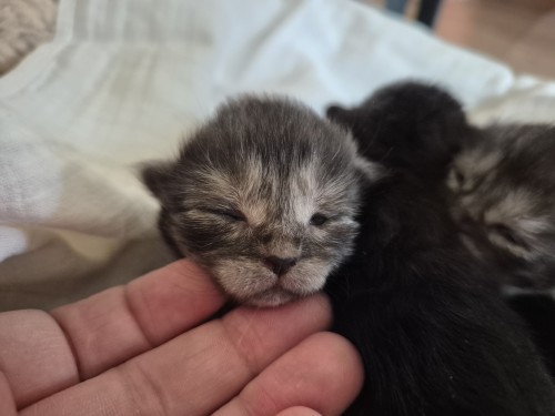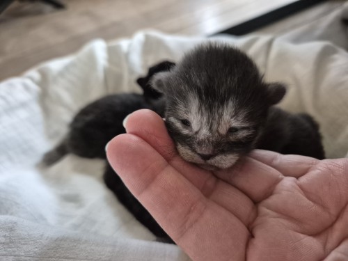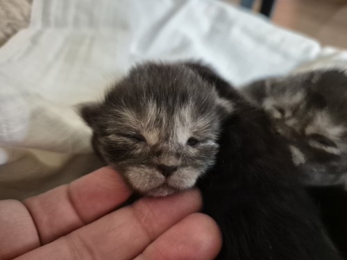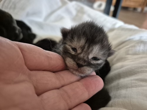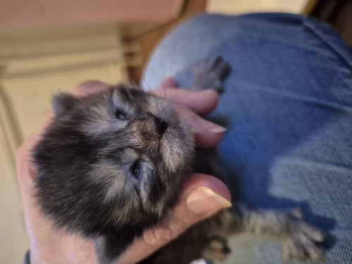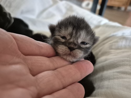 Dit is kitten 2. Alle 4 zijn ze aangekomen, super, dat betekent dat er melk is en dat ze goed kunnen drinken. De belangrijkste start voor een kitten.