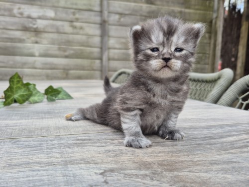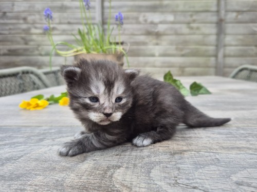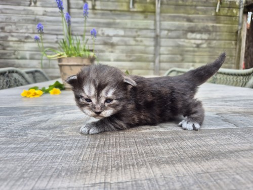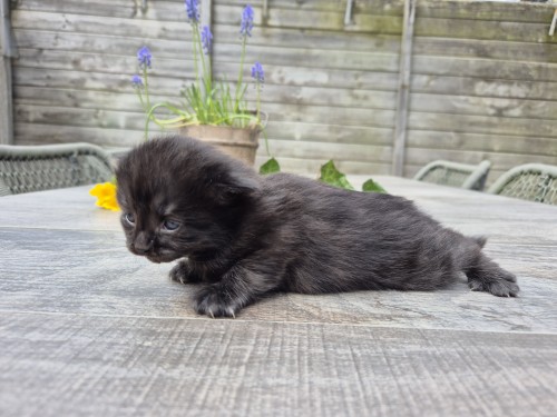 Black met enkele witte haren 114 gram 10:02 uur Optie vanuit de lijst van geïnteresseerden * Nadat alle mensen van de lijst van geïnteresseerden zijn bericht, weten we of er nog één of meerdere kittens beschikbaar komen. We achten de kans klein, maar is altijd aanwezig.