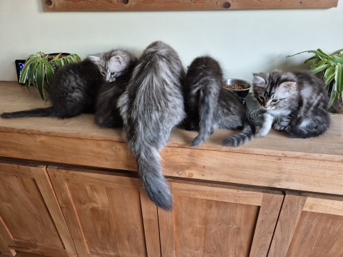 Ik heb ze van 2 kanten op de foto gezet, zodat je een beetje beter kunt zien wie wie is 🙂 Omdat bij de volgende fote Vlinder al vertrokken is en alleen haar glazen schaalte er nog staat, recht boven Vlinder ❤️ ❤️ Links boven zit Ice, schuin rechts voor hem (voor de kijkers) zit Harley en rechts van haar zit Bubbles. Voor Harley zit A.J. aan een schoteltje van een kitten (is vast véééél lekkerder) en voor haar zit Olivia. Dan de kittens. Rechts van Olivia zit Teuntje. Bovenaan voor Ice zit Dante, dan de drie heren die vlak bij elkaar zitten links is Nuvio, dan "in het midden tussen de 2 achterkanten van zijn broers zit Dali en rechts is Arie.