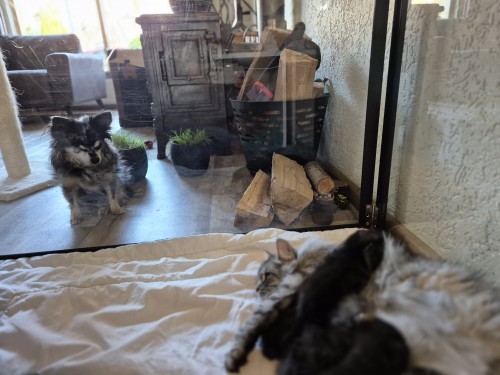 En dan zal ik jullie nog iets snoezigs laten zien. Fleur, die zit vol overgave de kittens te bewonderen. Ze zou er zo graag bij willen. Ze kan niet wachten tot ze uit de ren mogen om de woonkamer te gaan verkennen