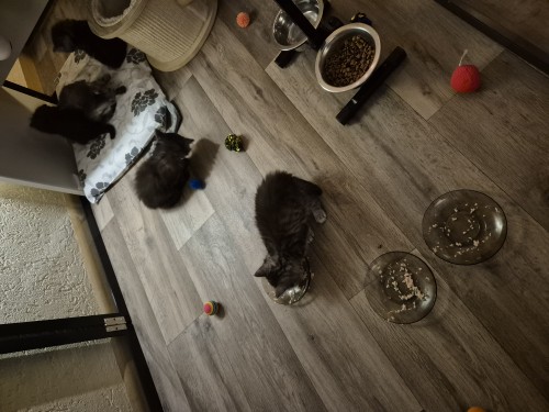 en hoe leuk is het om tegelijk te eten met de grote Siberen. Biscuit vindt het in ieder geval ook altijd leuk als er natvoer is, net als Fleur 😉