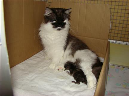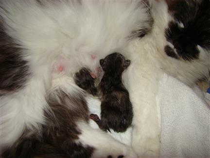 om drie uur 's middags herkende we het kitten "claimen" en wisten we dat het niet heel lang meer zou duren voordat de bevalling zou gaan beginnen Lemon deed het rustig aan en om 20:18 uur werd haar eerste kitten geboren zoals je kunt zien een echte man, Lemon wast heel goed haar smurfje om 20:50 al heerlijk aan de melkbar, ook al een heel eind droog maar zoals je ziet, nog niet helemaal zoals gezegd, Lemon deed het rustig aan, pas na 3 uur kwam de tweede Sari had niet zo veel geduld en wilde meteen al aan de melk hier al een beetje gefatsoeneers, links het katertje rechts het poesje trotse en tevrede mama wel een groot verschil in geboortegewicht tussen de twee en dat kan je ook goed zien als ze naast elkaar liggen en anders dan normaal is het poesje zwaarder dan het katertje 22-11-2015