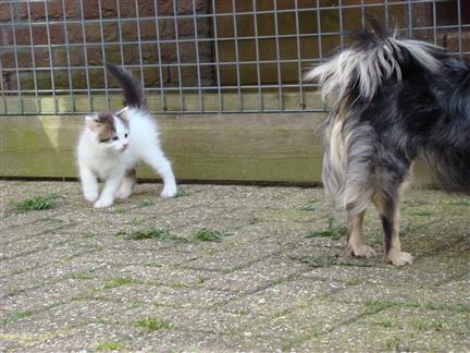 Noraly bekijkt het zittend Koda, je kan hier leuk haar tekening op haar achterpoten zien Hey, daar is Fleur Bobbie is bezig met een wasbeurt, je moet er wel knap uit zien als je de deur uit gaat vandaag wil Noraly wel mooi zitten voor de camera Koda doet haar entree even over haha Bobbie ligt lekker, daar was net nog de laatste zon Noraly Koda zoekt Bobbie op, kom je ook buiten spelen? Koda, wat een leuke foto vind ik dit en daar gaat ze weer en natuurlijk komt Bobbie ook buiten spelen druk op onderzoek Bobbie heeft vandaag vooral bodem onderzoek, er ligt daar van alles Koda gaat haar moeder eens lastig vallen altijd lachen met een staart je steekt je klauw erin en je weet nooit welke kant die op gaat Bobbie vindt het tijd voor actie op jacht komt ze een blaadje tegen als je goed kijkt op de volgende foto's zie je haar met het blaadje rond lopen ze is helemaal in haar nopjes met haar vangst 11-04-2018 Noraly vindt dat ze beter op niveua kan slapen ;-) al is even wakker worden voor wat foto's ook geen straf Koda en Bobbie slapen gween heerlijk samen in de mand kleur bij kleur zou je zo denken 12-04-2018 drinken bij mama, de foto's waren helaas niet scherp, maar het filmpje is ook leuk :-) klik hier voor het filmpje 13-04-2018, aan de melkbar v.l.n.r. Noraly, Bobbie en Koda Koda is een beetje afgeleid ;-) 14-04-2018 en soms zeggen bewegende beelden meer dan foto's,