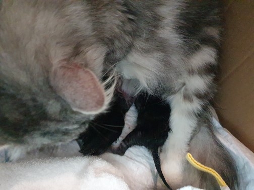 11:34 2 minuten geleden is het 3de kitten geboren (Ice). Omdat het persen om de een of andere reden weer erg pittig was, leg ik de kittens even veilig een stukje verderop. Zodat de moeder niet per ongeluk een kitten plet