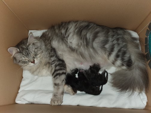 10:35 Natalka had het zwaar met de bevalling, ze wist niet goed in welke houding het ging lukken. Uiteindelijk is het eerste kitten geboren (Finn). Natalka is wat dat betreft een geboren moeder, ze kan alles zonder hulp. Toch maak ik altijd meteen het vlies kapot en het kopje schoon. Zo is de kans op het binnenkrijgen van vruchtwater het kleinst. Natalka navelt zelf af en voor je met je ogen knipperd heeft ze ook het nageboorte opgegeten. Iets dat Harley bijvoorbeeld beide niet doet. 10:45 en daar is het tweede kitten al (Mimi). De aanloop koste moeite, maar nu gaat het heeeel vlot.