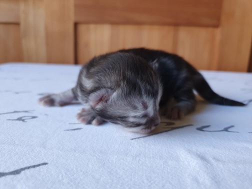11:00 We hebben hier al beide geslachten :-) een poesje en een katertje. Het katertje Finn is de eerstgeborenen en weegt 95 gram. Daarna dus het poesje Mimi. Zij weegt 85 gram. Beide zijn black silver tabby, maar je kan al zien dat beide een ander tabbypatroon hebben. Dus hoef ik niet te merken tot nu toe.