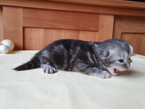 Net als zijn broertje heeft hij nog net een hoekje niet helemaal open van zijn oogjes. Verderop zie je dat hij er heel trots op is zoals hij daar met zijn koppie in de lucht ligt. De oogjes zijn blauw, dat blijft nog even zo, maar later gaan ze verkleuren naar groen of geel groen.