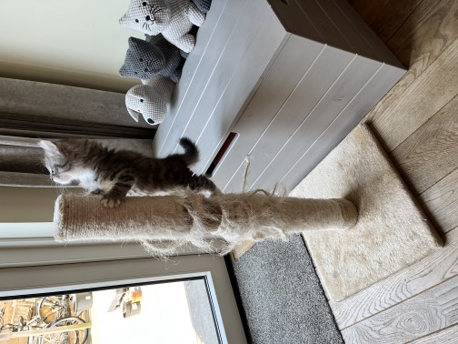Kijk, ik ben Ice en al heel volwassen, want als je volwassen bent ga je op de grote krabpaal liggen en dan ga je naar buiten kijken. Dus ga nu maar weer, dan kan ik weer naar buiten kijken ;-)