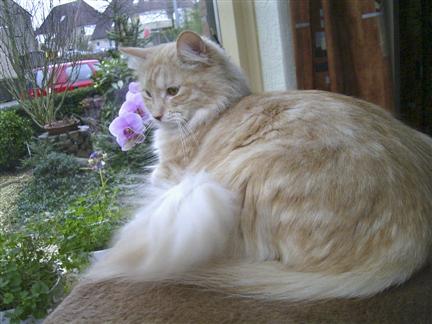 Lieve Bo-J (Bo-Djee spreek je het uit) heeft genoten van een leven bij mijn vriendin in Zeewolde. Hij heeft samen met Shyloh (uit ons tweede nest) en nog 4 Noorse boskatten heel wat beleefd. Zelf had hij ook zijn grapjes (vond hij dan), zoals een tampon in de waterbak gooien en dan daarna het touwtje pakken en door het huis rennen.... of iedereen dat zo grappig vond als Bo-J 😉